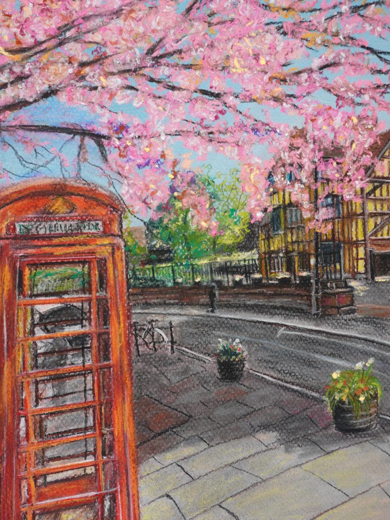 £60.00Flowering tree in Shrewsbury I think this species is recognized by all locals. A tree blooming magnificently with pink blossoms, next to a phone booth and opposite a bright yellow old house.